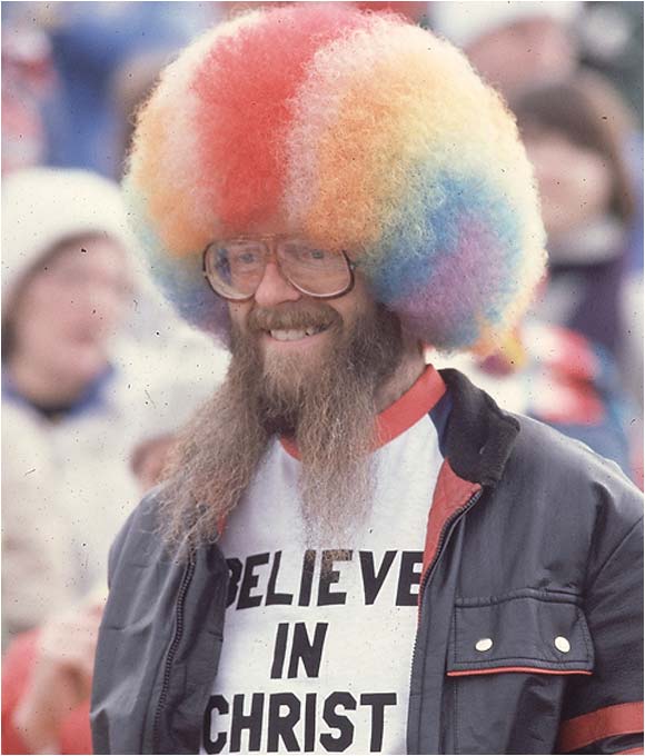 In 1980, Mr. Rollen got religion. Afire with enthusiasm for his newfound Christian faith, he began applying his talent for getting himself in the camera viewfinder to the task of spreading the good news. He traded his rainbow wig for a John 3:16 sign. Others began emulating his unorthodox witnessing methods, and an American sports tradition was born.